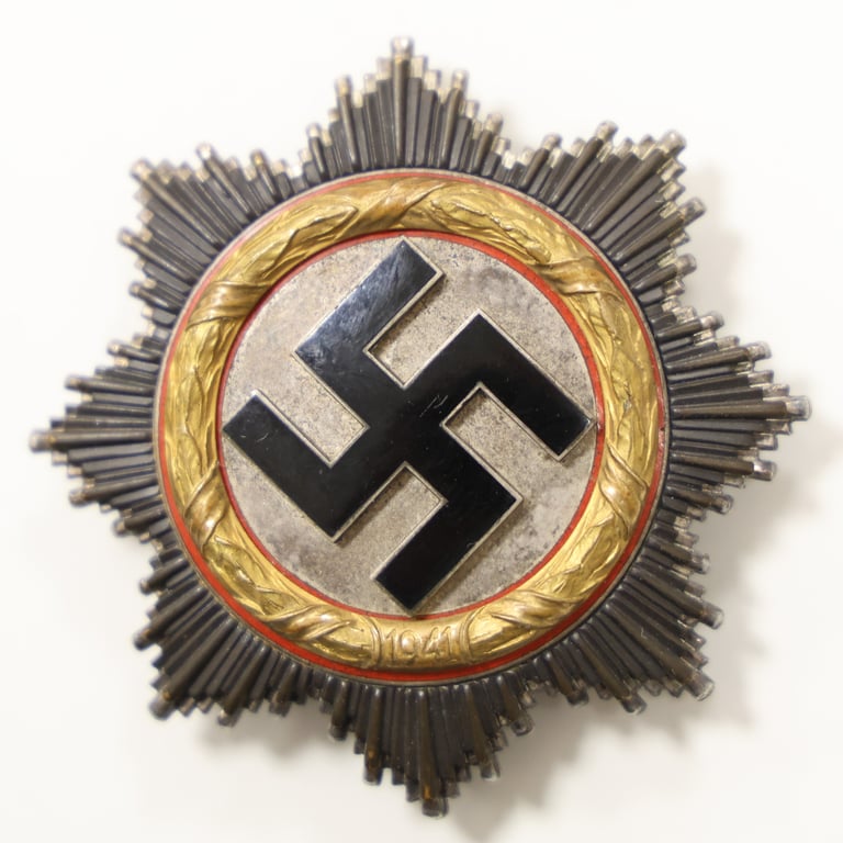 The Deutsches Kreuz in Gold was instituted by Adolf Hitler on September 28, 1941, and was awarded in two versions: gold and silver. The gold version was presented to military personnel for acts of exceptional bravery, while the silver version was awarded for distinguished service in support of the war effort. This decoration was worn on the lower right side of the uniform.