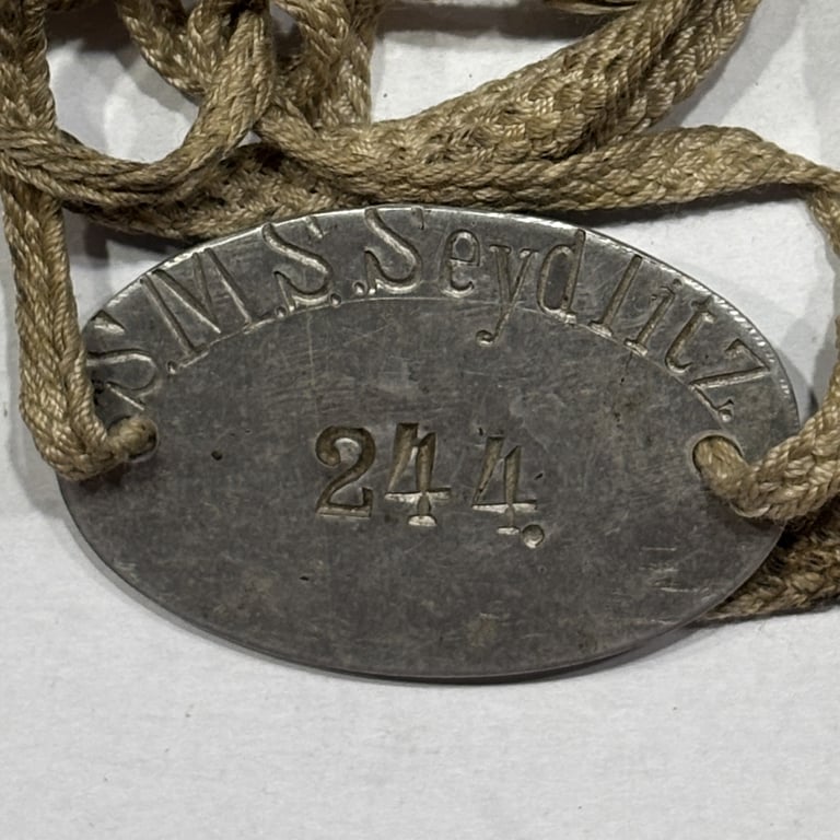 Rare Imperial German Navy dog tag attributed to the battlecruiser S.M.S. Seydlitz, a prominent ship of the High Seas Fleet during WWI. A historic naval piece linked to one of Germany’s most famous warships, involved in major engagements such as the Battle of Jutland. A must-have for naval or WWI collectors.