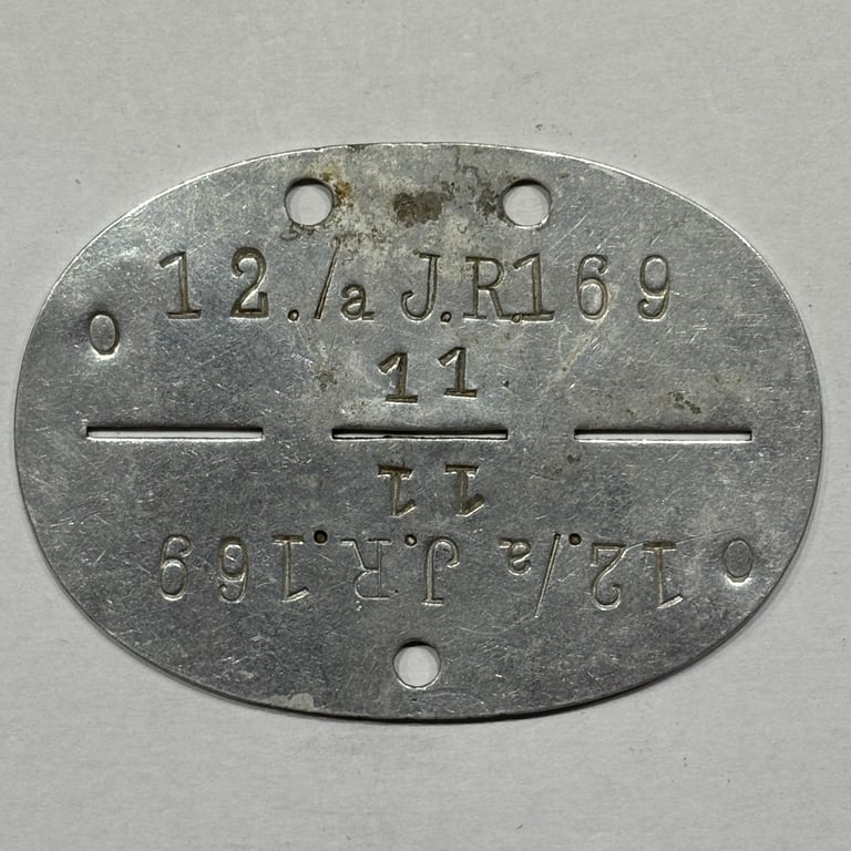 Original German WWII army dog tag from the 12th Company, Infantry Regiment 169. Aluminum construction with clearly stamped unit designation. A genuine ID tag from a frontline infantry unit, ideal for collectors of Eastern Front or Wehrmacht history.