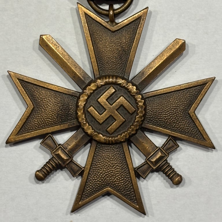 War Merit Cross with Swords, awarded for meritorious service under combat conditions. Features a bronze Maltese cross with crossed swords and includes ribbon. A significant collectible for WWII militaria enthusiasts.