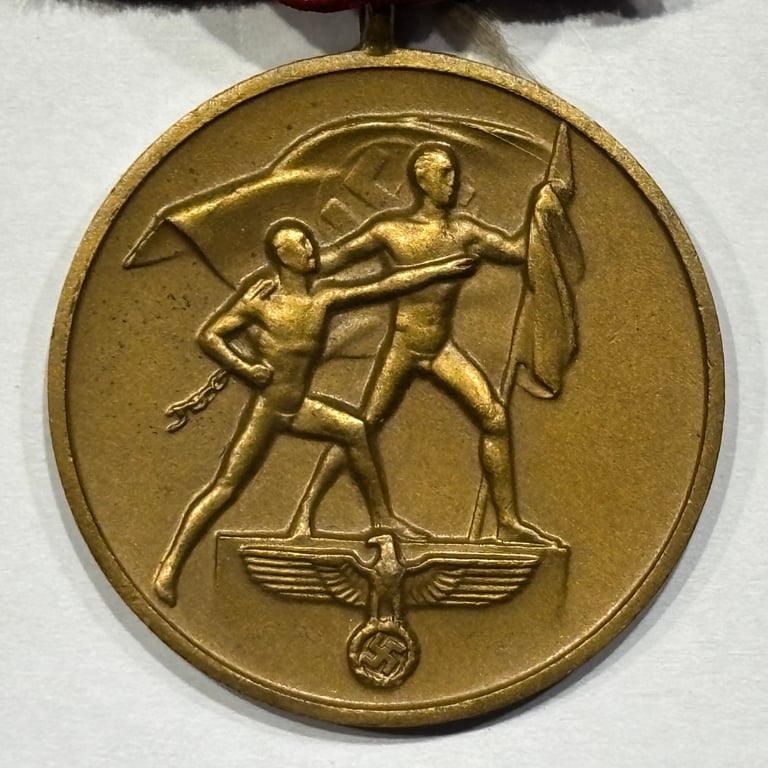 German Anschluss Medal, awarded for participation in the annexation of the Sudetenland in 1938. Bronze-toned medal featuring two figures with a Nazi flag and the date "1. Oktober 1938." Includes original ribbon.