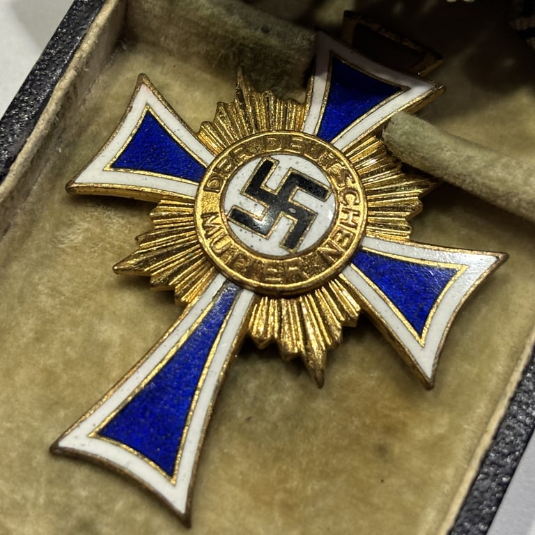The Gold Mother’s Cross was awarded to women with eight or more children, symbolizing their contribution to the German Reich. This piece is crafted with a white and blue enameled Maltese cross, gilded accents, and suspended on the traditional blue and white ribbon.