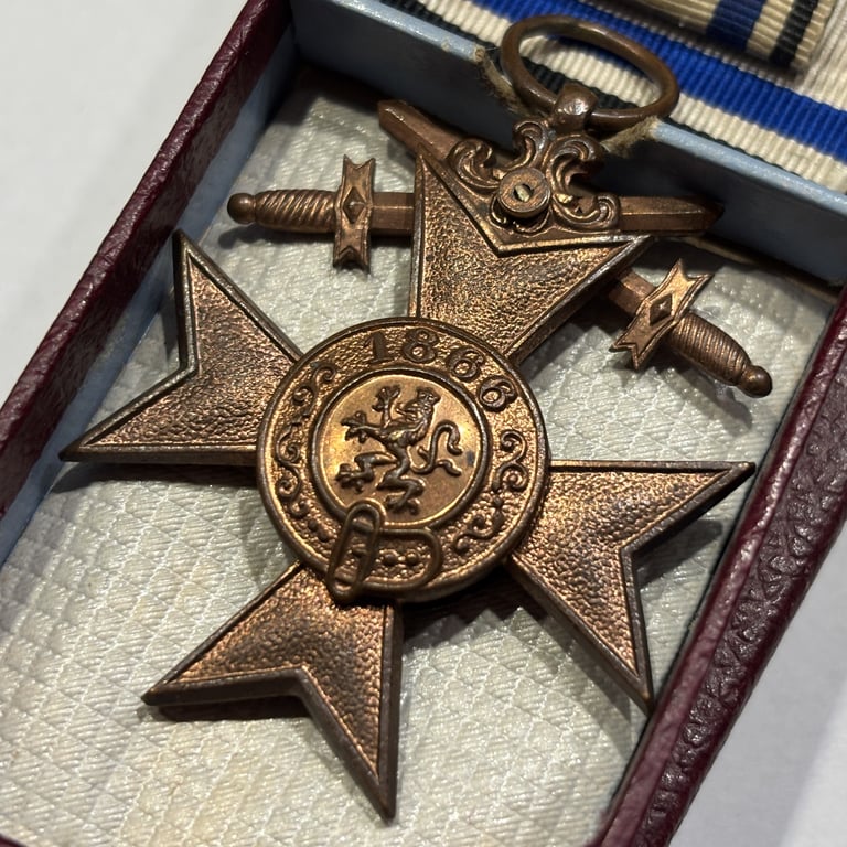 This decoration was the Kingdom of Bavaria’s equivalent to the Prussian Iron Cross, awarded to NCOs and enlisted men for acts of bravery or distinguished service in combat. The addition of crossed swords indicates the award was earned in the face of the enemy.