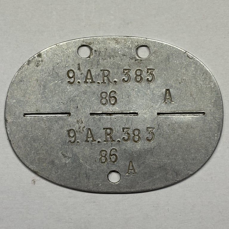 German WWII identification tag (Erkennungsmarke) issued to a soldier of the 9. Batterie, Artillerie-Regiment 383.