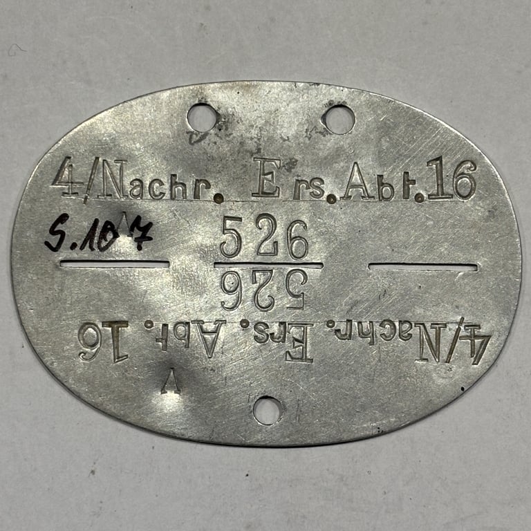 Original WWII German Erkennungsmarke from the 4th Company of Nachrichten-Ersatz-Abteilung 16, the Wehrmacht’s signals replacement battalion.