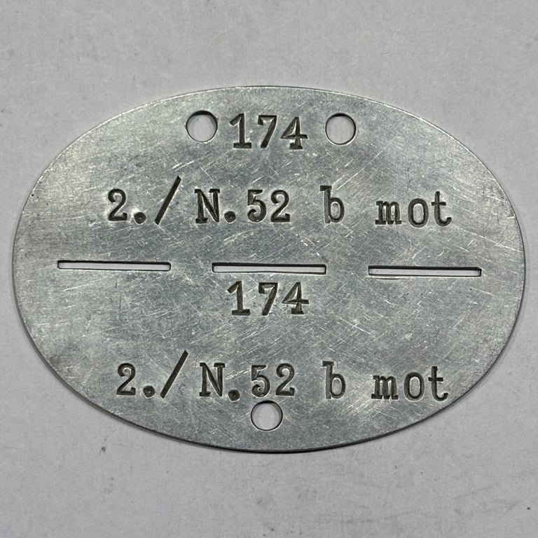 Original WWII German Erkennungsmarke from 2. Kompanie / Nachrichten-Abteilung 52 b (motorisiert), a motorized signals company of the Wehrmacht. This unit provided mobile communications support—radio, telephone, and dispatch—primarily for fast-moving infantry and Panzer divisions. A highly collectible and rare ID tag from a specialized motorized signal corps formation. Ideal for WWII militaria collectors and German communications unit enthusiasts.