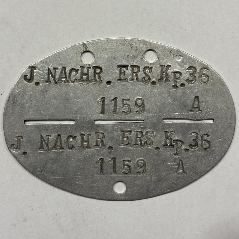 Genuine Erkennungsmarke (dog tag) issued to Soldier No. 1157 from the Nachrichten-Ersatz-Kompanie 36 — a communications replacement company of the Wehrmacht.