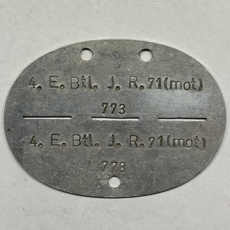 Original WWII German Erkennungsmarke from the 4th Company, Ersatz-Bataillon Infanterie-Regiment 71 (motorisiert). This unit trained motorized light infantry troops—fast-moving soldiers equipped for reconnaissance, skirmishing, and support missions. A rare ID tag tied to mobile infantry forces, ideal for collectors of German militaria and Infanterie history.