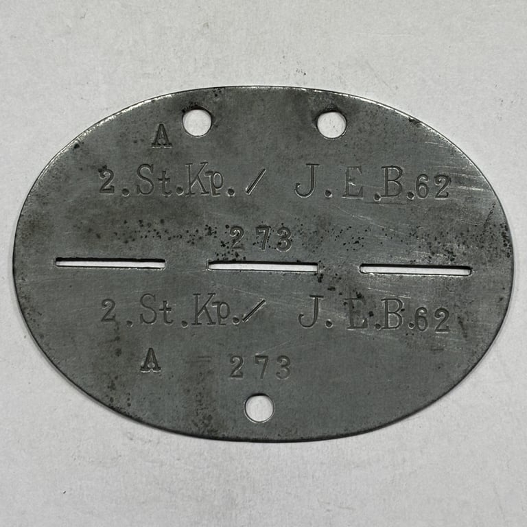 Original WWII German Erkennungsmarke from the 2nd Stamm-Kompanie / Infanterie-Ersatz-Bataillon 62, based in Landshut, Bavaria (Wehrkreis VII). This unit trained and assigned infantry recruits—many of whom were sent to frontline formations like the 7. Infanterie-Division.