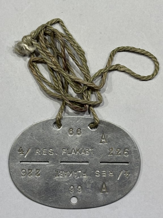 Stamped “4./Res. Flakabt. 226”, the tag includes the soldier’s number "66" and blood group "A". The aluminum disc is well-preserved and includes the original field cord — a rare addition that enhances collectability.