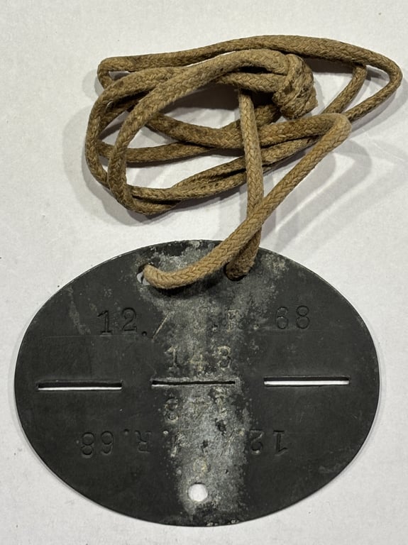 Authentic German WWII ID tag (Erkennungsmarke) issued to a soldier in the 12th Company of Infantry Regiment 68, part of the veteran 23rd Infantry Division.