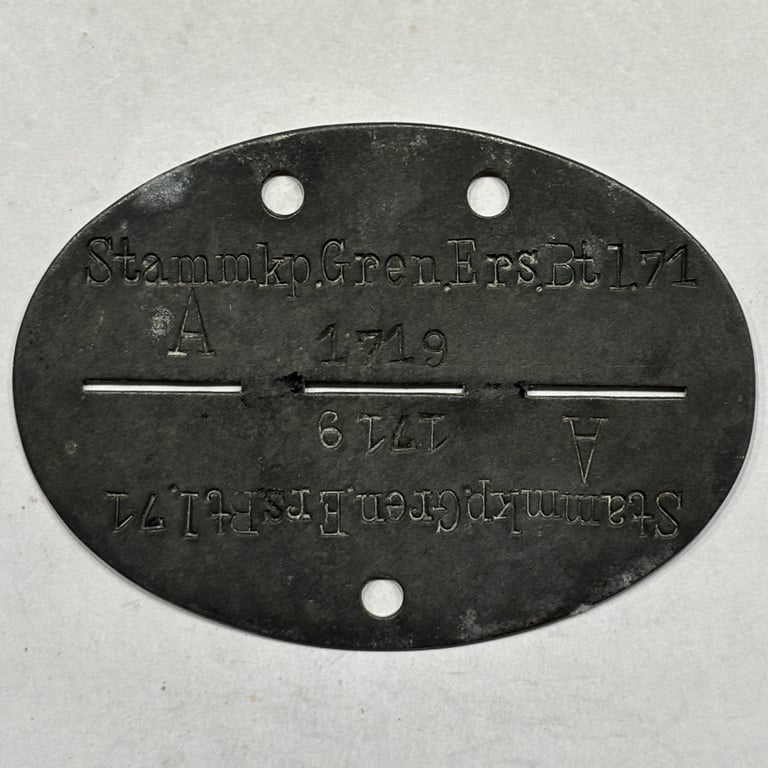 Offered here is an authentic WWII German Erkennungsmarke (ID tag) issued to a soldier of the Stammkompanie (Staff Company) of the Grenadier-Ersatz-Bataillon 171.