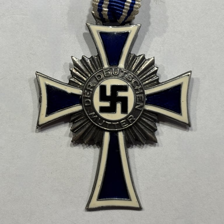 This is an authentic German Mother’s Cross in Silver (Ehrenkreuz der Deutschen Mutter), awarded from 1938 onward to women who bore four to five children in recognition of their service to the nation. This second-class decoration features the original blue and white enamel cross, silver-toned finish, and the full-length original ribbon.
