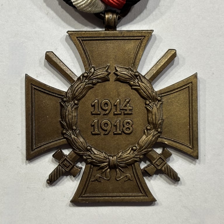 This is an original Cross of Honour of the World War 1914–1918 with Swords (Ehrenkreuz für Frontkämpfer), commonly known as the Hindenburg Cross. Instituted in 1934 by President Paul von Hindenburg, this bronze combatant version—with crossed swords—was awarded to WWI frontline veterans of the Imperial German Army.<BR>