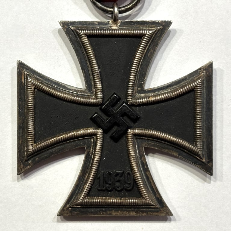 This is an authentic Iron Cross 2nd Class 1939 (EK2), one of the most iconic and recognizable German military decorations of WWII. Awarded for acts of bravery or leadership on the battlefield, the EK2 features a blackened iron core with a silver frame, displaying a swastika in the center and the year 1939 below.