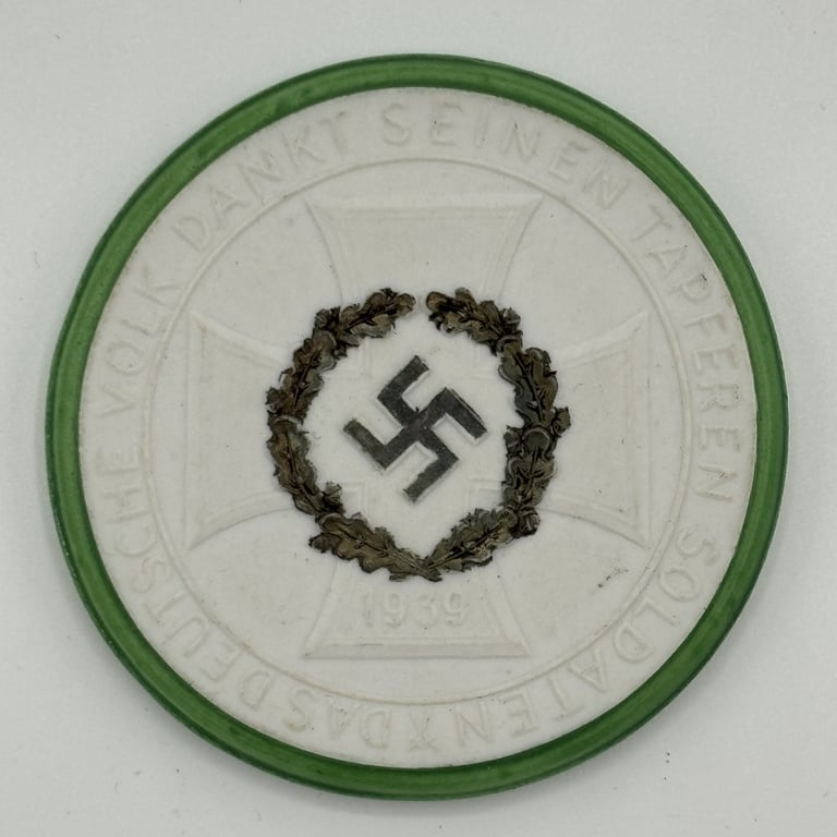 The front side features a prominent Iron Cross design with oak wreath and swastika, surrounded by the raised inscription: "Das Deutsche Volk dankt seinen tapferen Soldaten – 1939" (The German people thank their brave soldiers).The reverse depicts a battle map highlighting strategic locations such as Kiew, Gomel, Romny, and Lubny, with battlefield data: 665,000 Soviet POWs, 885 tanks, and 3718 artillery pieces captured. These plaques were distributed as morale-boosting souvenirs or display pieces, typically made from plaster or resin with painted edges—this one features a green border.
