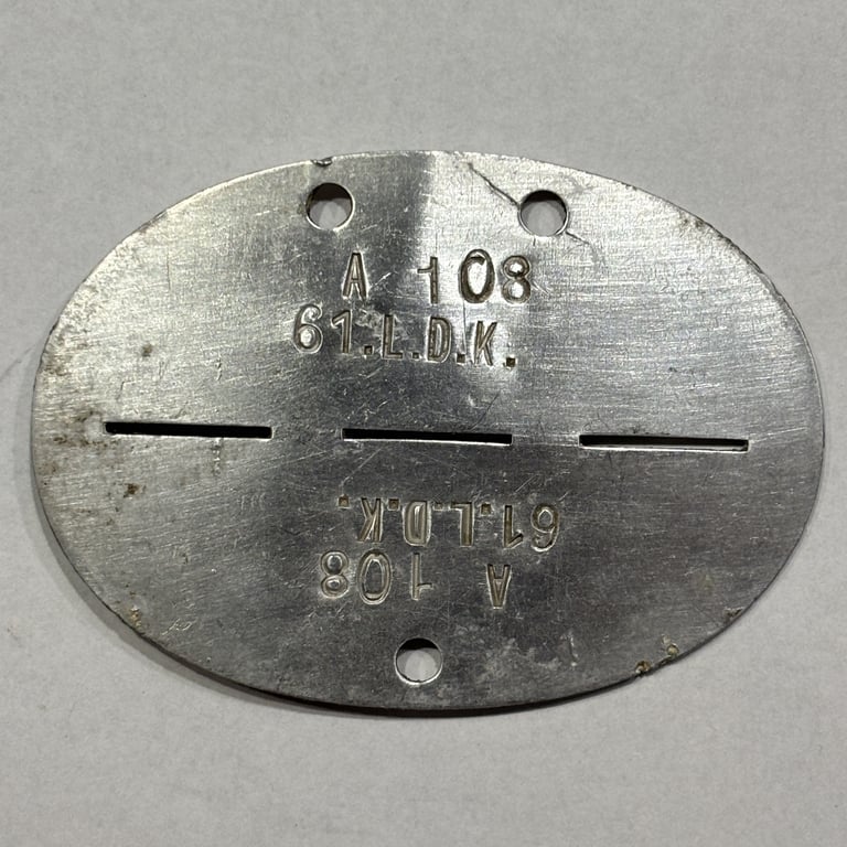Offered here is an authentic WWII German identification tag (Erkennungsmarke) belonging to a member of 61. Luftdienst-Kommando (61. L.D.K.) — a Luftwaffe service command unit. These units were part of the German Air Force's ground organization, responsible for logistics, airfield security, and operational support duties across the Reich and occupied territories.