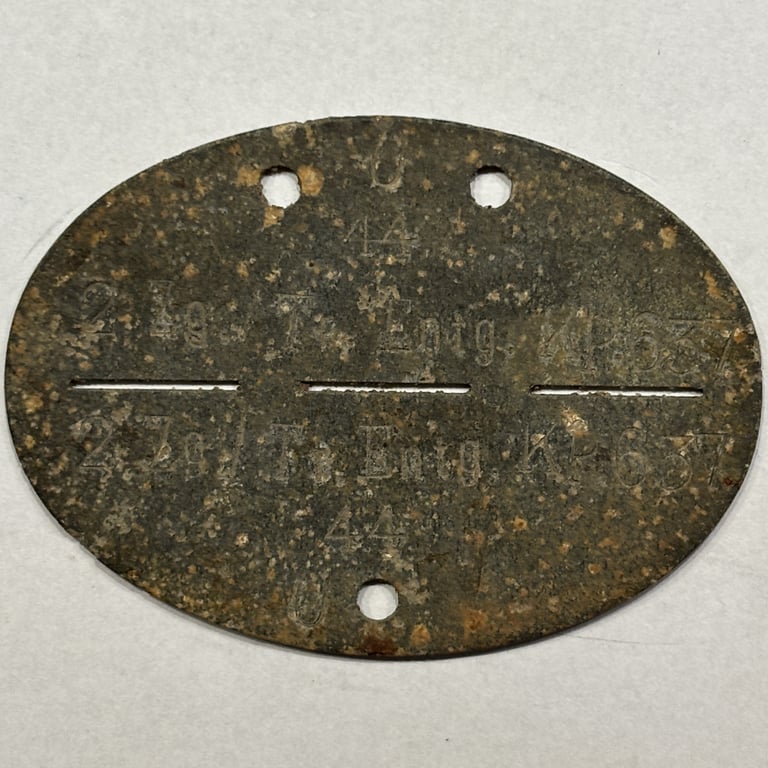 An authentic Wehrmacht Erkennungsmarke (identity disc) issued to a soldier of the 2. Zug der Truppen-Entgiftungskompanie 637, a rare chemical warfare decontamination unit operating under the German Army during the Second World War. This unit was tasked with NBC (nuclear, biological, chemical) decontamination, a critical support role especially on the Eastern Front, where chemical and gas threats were taken seriously during the intense campaigns.