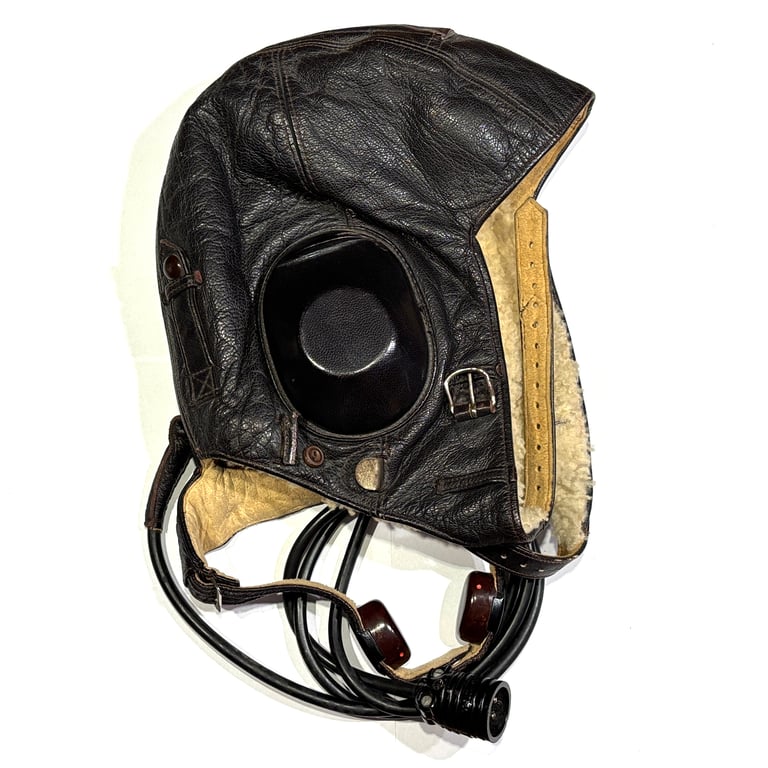 This helmet was used by pilots of the Jagdgeschwader, Kampfgeschwader, and Zerstörer units flying in cold and high-altitude missions. The interior shearling is still soft, the leather remains supple, and all components are intact, including Bakelite elements and buckles.