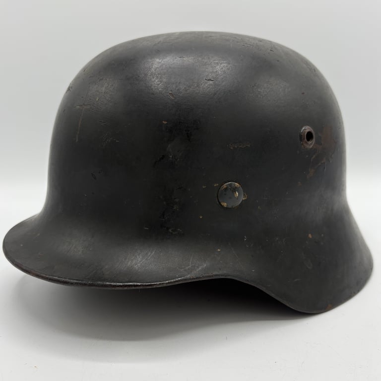 Original Luftwaffe M35 ND (No Decal) helmet, in the classic early-war “Legion Condor” configuration, finished in a smooth dark blue-grey Luftwaffe paint. This helmet represents one of the earliest patterns used by Luftwaffe personnel, most notably by units deployed during the Spanish Civil War.