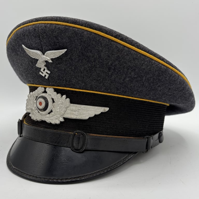 This outstanding Luftwaffe enlisted/NCO visor cap is a textbook early-war example, Erel Sonderklasse, made by Robert Lubstein in 1938, as clearly marked inside the sweat diamond. The cap is beautifully constructed from Luftwaffe blue-grey wool with yellow piping indicating flight/paratrooper branch of service.