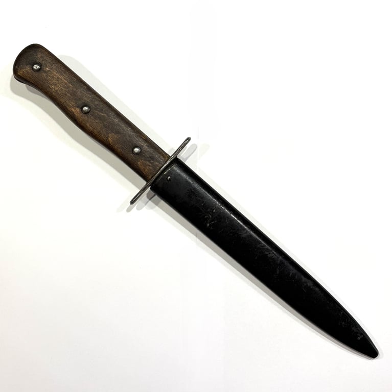 This is an original example of a German Luftwaffe fighting knife issued during World War II. These knives were typically carried by Luftwaffe ground personnel and paratroopers (Fallschirmjäger) as a utility and close-combat weapon.