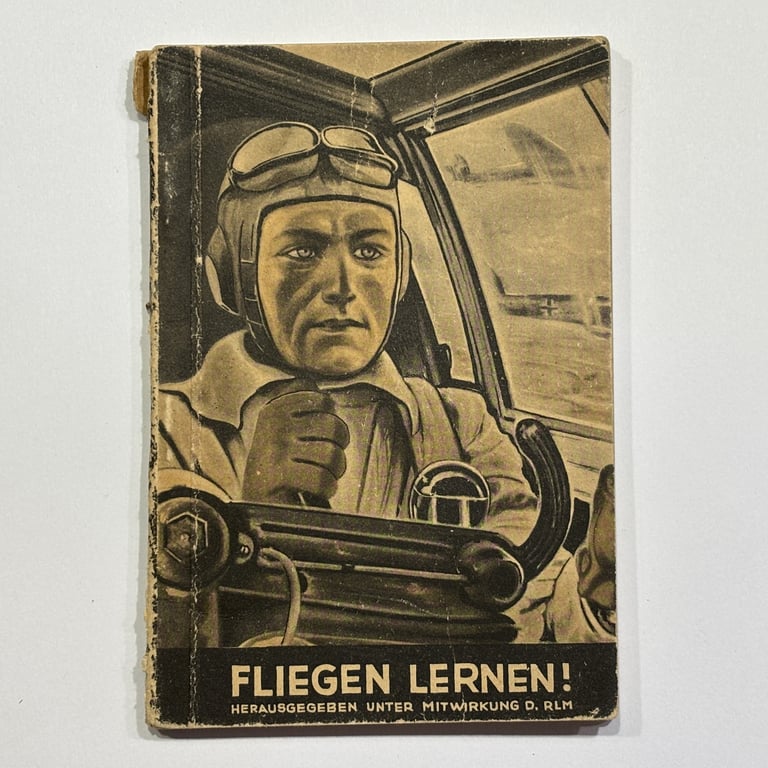 This is an original copy of the WWII-era German aviation handbook titled "Fliegen Lernen!" (translated: Learning to Fly!), published with the cooperation of the Reichsluftfahrtministerium (RLM) – the German Ministry of Aviation. This manual was intended as an introductory guide for young aviation cadets and aspiring pilots of the Luftwaffe.