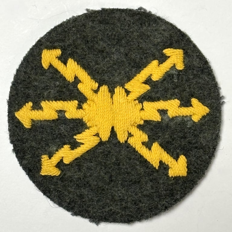 - Design: The patch is constructed from field-grey wool and features an embroidered yellow motif of intersecting lightning bolts, radiating from a central point. The lightning bolts symbolize electrical signals, reflecting the wearer's role in communications.