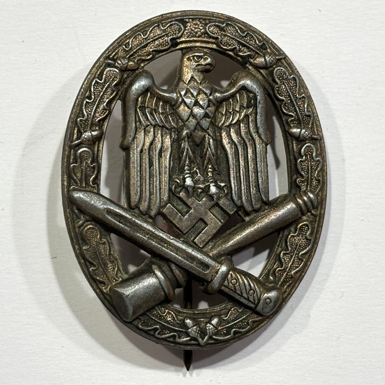 This is an authentic example of the General Assault Badge, awarded to Wehrmacht personnel who participated in infantry support roles during combat but did not qualify for the Infantry Assault Badge. Introduced on June 1, 1940, the decoration was presented to combat engineers, artillery, anti-aircraft, anti-tank, and other non-infantry units involved in three or more assaults.