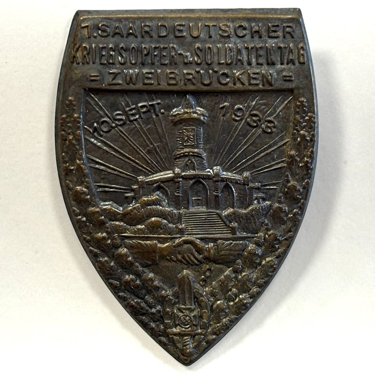 Held shortly before the 1935 Saar status referendum, this event was part of wider propaganda and solidarity efforts to promote reunification of the Saar region with Nazi Germany. The badge was issued to attendees and participants at the gathering honoring German WWI veterans and war-disabled individuals (Kriegsopfer).