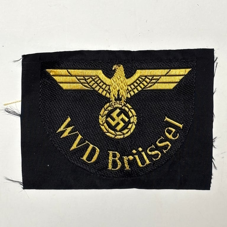 This is an authentic WWII German Reichsbahn (State Railway) sleeve eagle, specifically issued to members of the WVD Brüssel – Wehrmacht Verkehrsdirektion Brussels, the military traffic administration for occupied Belgium.