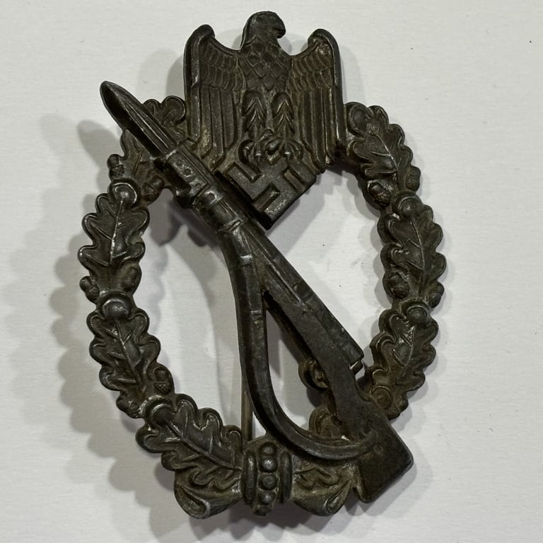 This is a genuine Wehrmacht Infantry Assault Badge in Silver, awarded to German Army infantrymen who participated in at least three separate infantry assaults on different days during WWII.