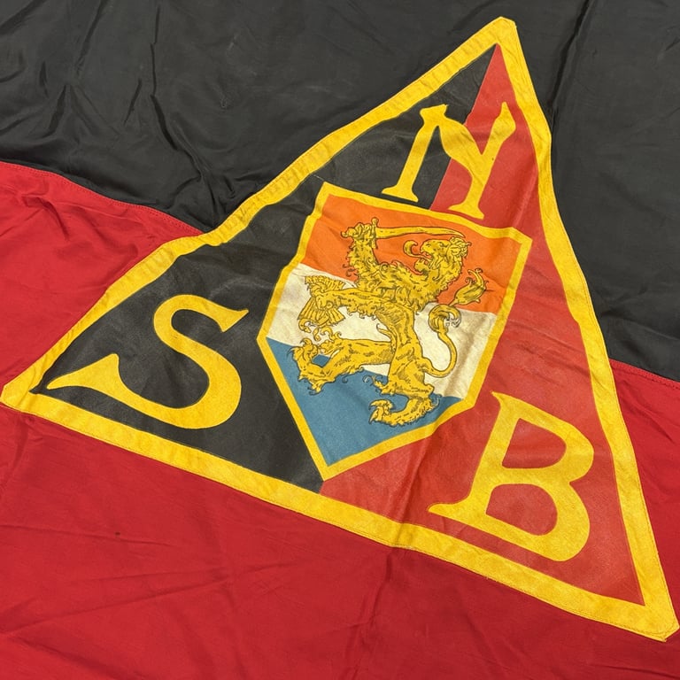 This flag belonged to the NSB (Nationaal-Socialistische Beweging) — the Dutch National Socialist Movement, a fascist political party that operated in the Netherlands from 1931 to 1945. The NSB is historically significant for its collaboration with Nazi Germany during the occupation of the Netherlands in World War II.