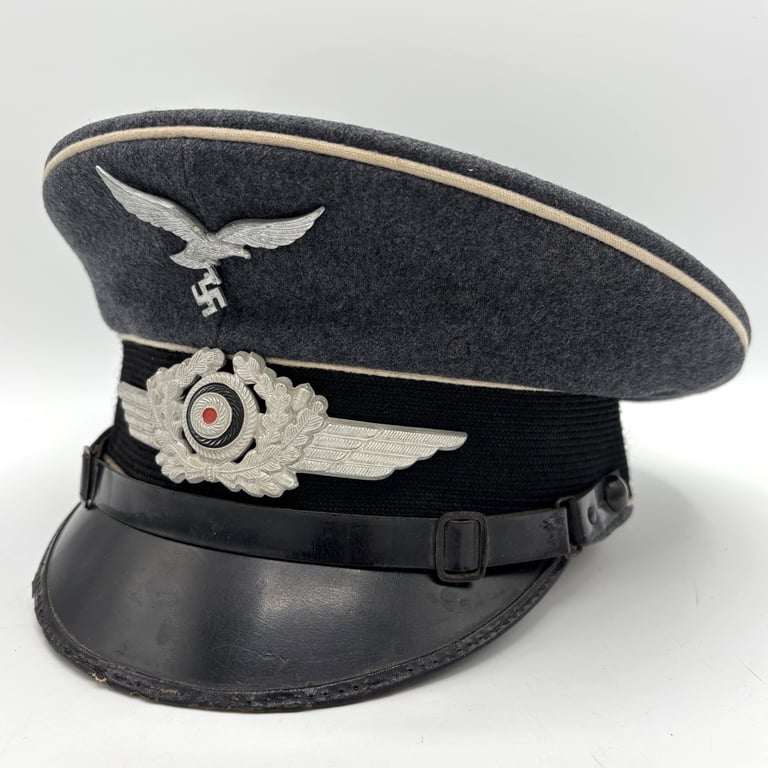 This visor cap is a historically significant piece of Luftwaffe headgear, dating to 1936, as marked under the celluloid sweat shield. It was produced by G.A. Hoffmann of Berlin, one of the premier and most recognizable cap manufacturers of the Third Reich period.