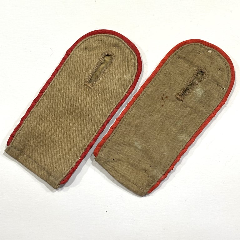 Genuine pair of Luftwaffe tropical enlisted shoulder boards, worn by a Soldat in a Flak-Artillerie unit. Constructed from durable tropical tan cotton twill with red Waffenfarbe piping, indicating anti-aircraft service. These EM/NCO-style boards are in used condition, showing light wear consistent with field use. Perfect for completing an Afrika Korps or Mediterranean theater uniform setup. Scarce and original example of Luftwaffe tropical insignia.