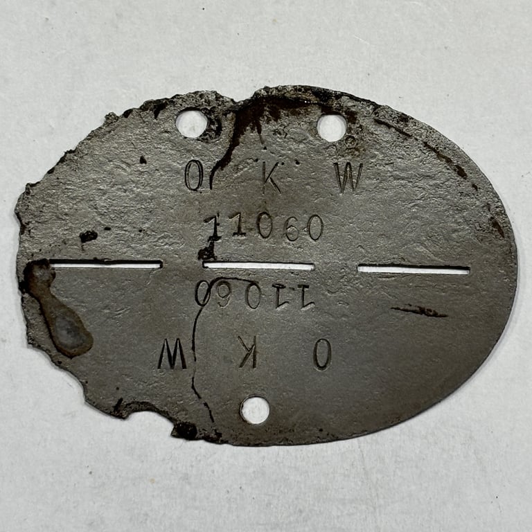 Step into history with this authentic WWII German Erkennungsmarke (dog tag) stamped "O.K.W. 11060". Issued by the Oberkommando der Wehrmacht (OKW) — the High Command of the German Armed Forces — this identification tag belonged to a member of the administrative or operational staff under one of the most significant military authorities of the Third Reich.