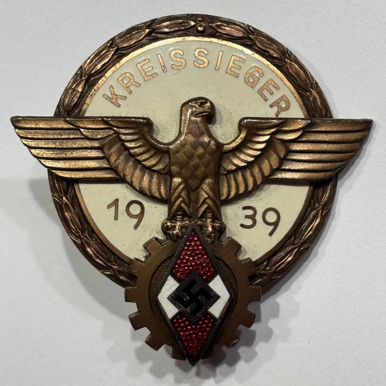This is an original Hitler Youth (HJ) Kreissieger 1938 Award Badge, issued to the district winners (Kreissieger) of the Reichsberufswettkampf (National Vocational Competition). These awards were introduced in 1938 and came in three grades, distinguished by color:
