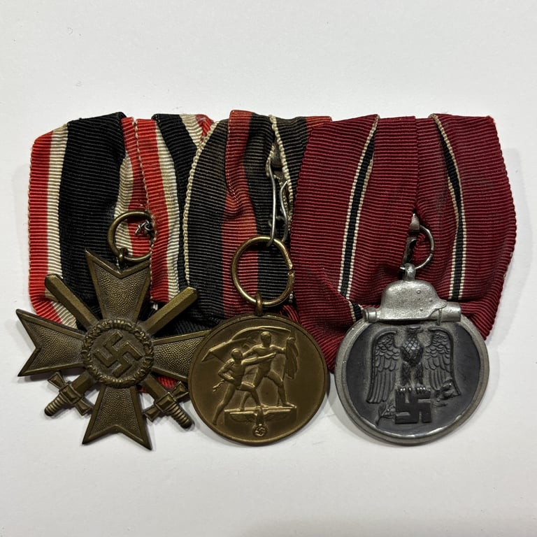 Original three-place WWII medal bar, featuring the War Merit Medal, the 1938 Sudeten Medal, and the Eastern Front Medal (Winterschlacht im Osten 1941/42). Mounted on period ribbon backing, this combination represents awards commonly earned by German military and supporting personnel during the late 1930s and early stages of WWII.