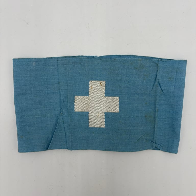 This is a well-preserved example of a Luftschutz armband, produced in the characteristic sky blue rayon material commonly used for civil defense identifiers during WWII. The armband features a white cross woven directly into the fabric in classic Bevo style, giving it a crisp and period-correct appearance.