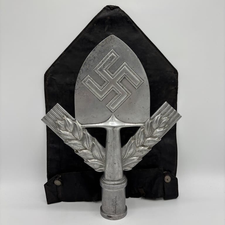 This authentic RAD (Reichsarbeitsdienst) Flag Pole Finial is an impressive and highly collectible example of Third Reich ceremonial equipment. Manufactured by Gebrüder Cossack, Neheim-Ruhr, it features the iconic spade and wheat sheaf emblem, symbolizing labor service and agricultural contribution within the RAD organization.
