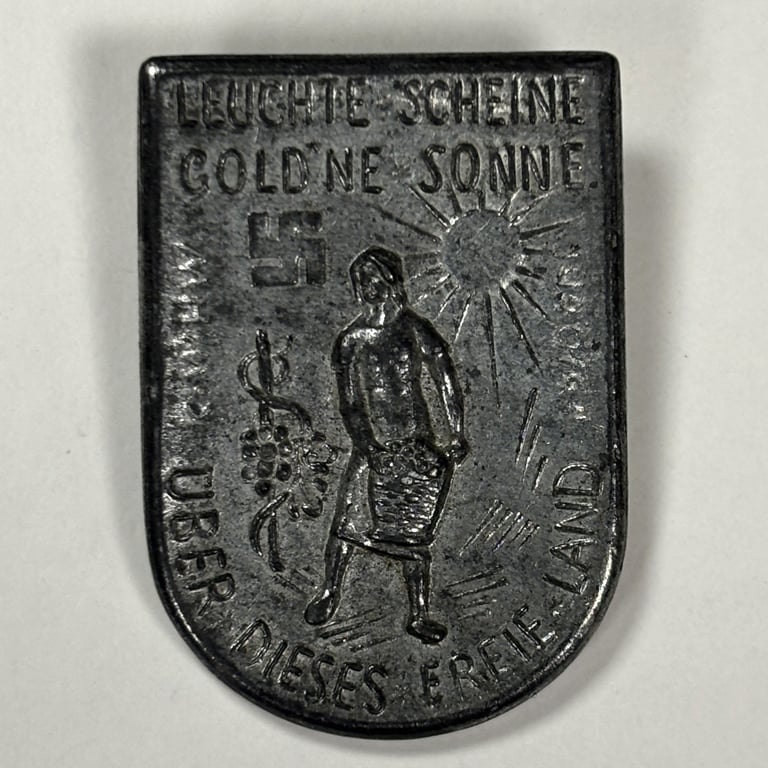 A desirable and collectible WHW tinnie representing a specific regional Gau, ideal for collectors of Third Reich social welfare badges, political insignia, or German home-front memorabilia.