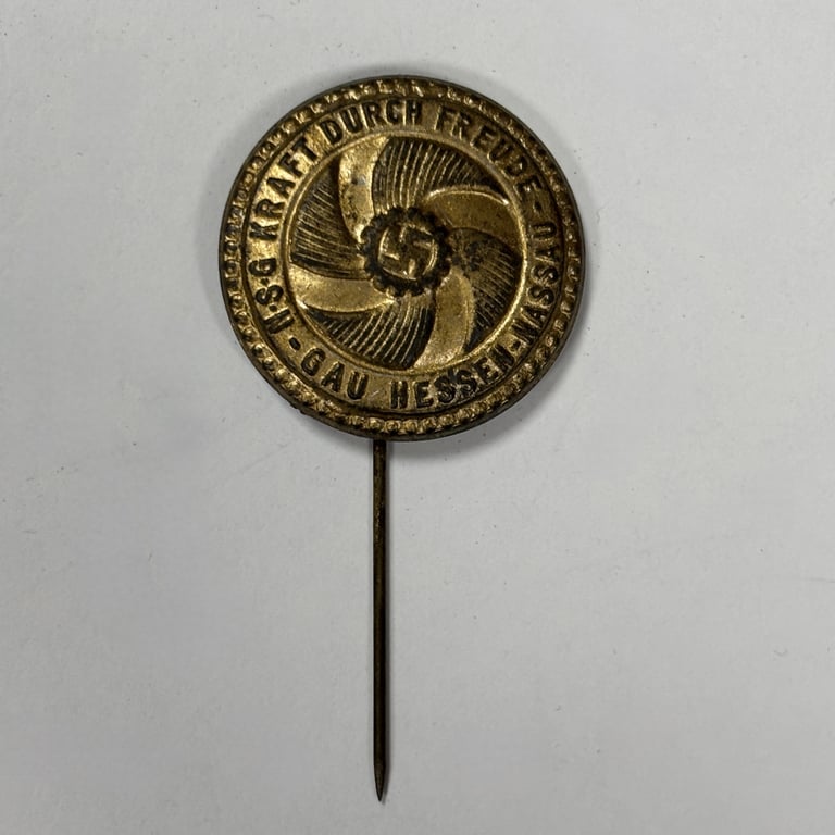 Original Third Reich–era Kraft durch Freude (KdF) stickpin issued for the Gau Hessen-Nassau, associated with the NS-Gemeinschaft Kraft durch Freude (N.S.G.) organization. This authentic WWII German lapel pin features the classic circular KdF turbine-style emblem with central swastika, surrounded by the raised inscription “NSG. KRAFT DURCH FREUDE – GAU HESSEN-NASSAU.”