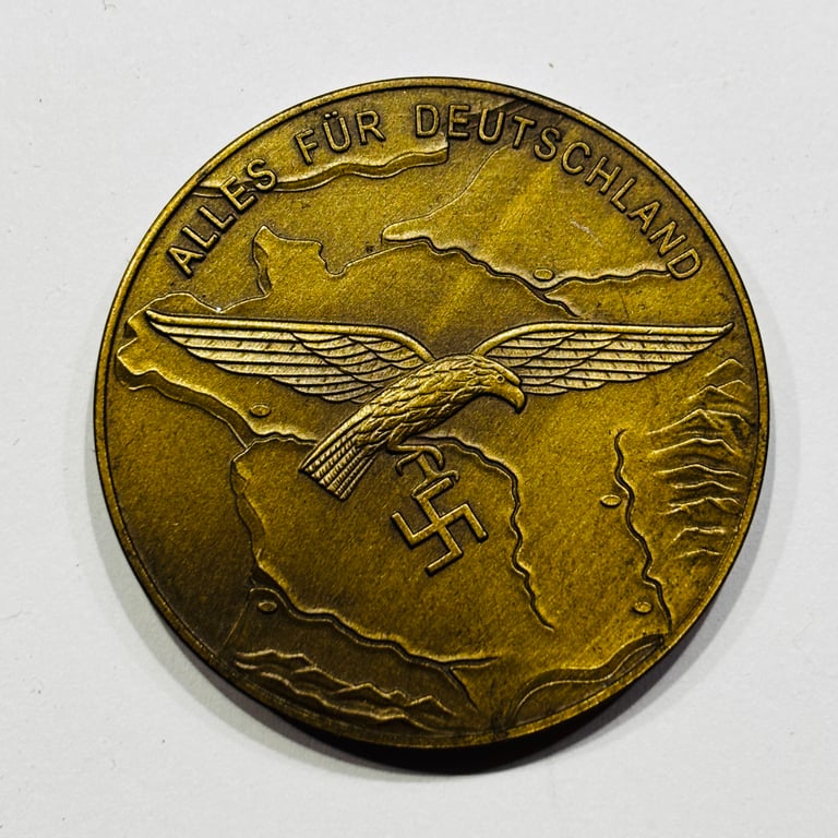 The medal is struck in bronze and shows clear, well-defined details. The obverse features the Luftwaffe eagle over a map motif with the inscription “Alles für Deutschland”, while the reverse (not shown) follows the standard Luftwaffe commemorative style. The surface displays an attractive, untouched patina consistent with age, adding to its authenticity and collector appeal.