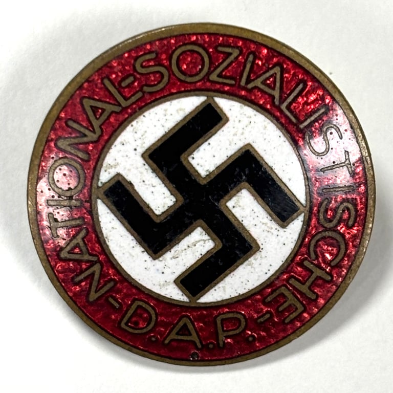 This listing offers an authentic NSDAP membership badge, constructed in metal with red, white, and black enamel and featuring the classic circular design used by party members during the period. This was the standard pattern badge worn on civilian clothing to identify membership within the organization.